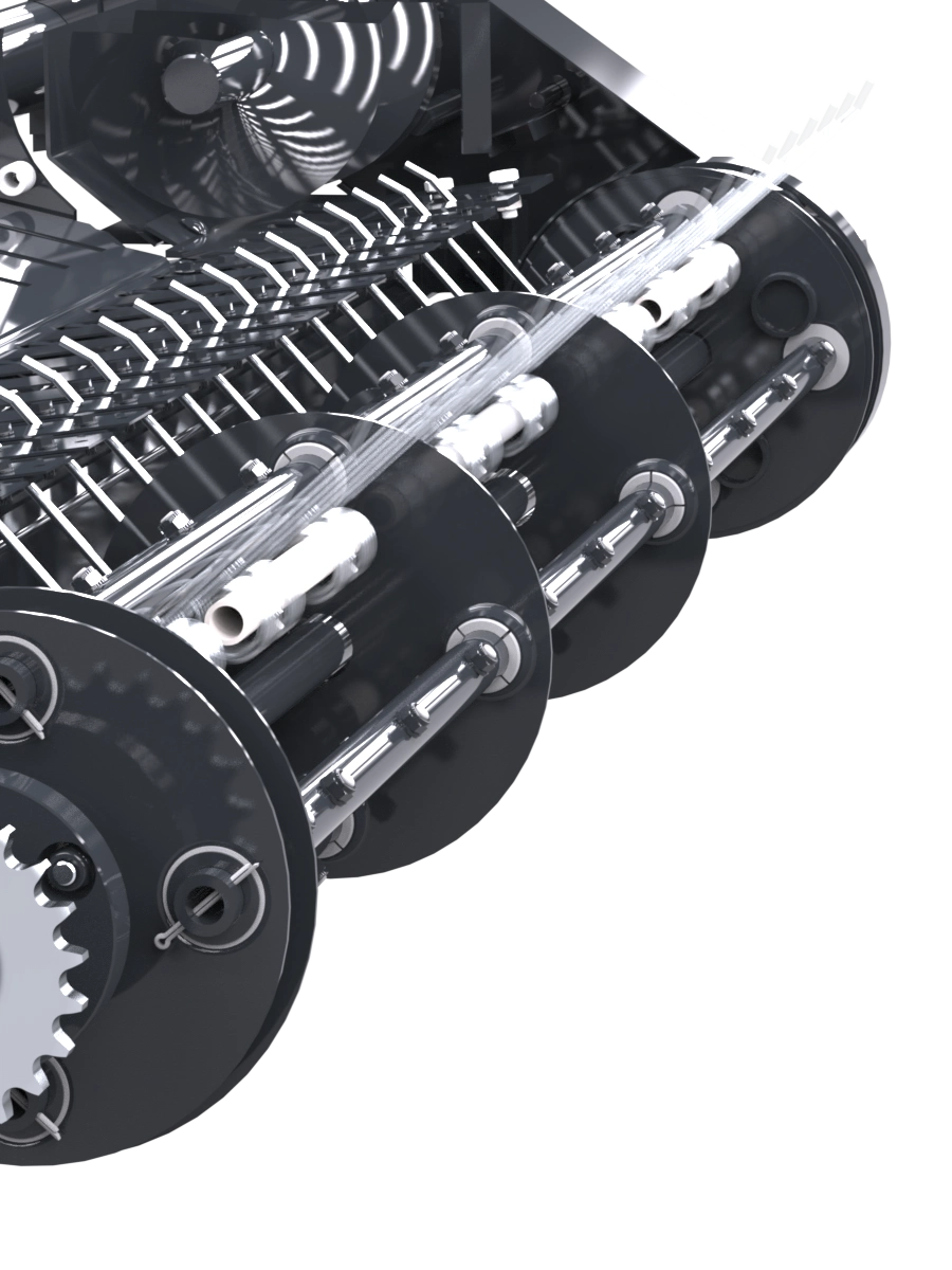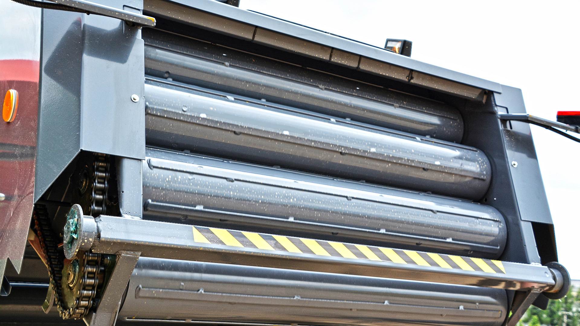 Walcowa komora zwijania oparta na 16 walcach zapewnia dokładne i równomierne zagęszczenie bel na całym ich obwodzie. Karbowane walce skutecznie ograniczają poślizg materiału, gwarantując wysoki stopień zgniotu przy niskim zapotrzebowaniu mocy. Mechaniczny zamek komory odciąża hydraulikę ciągnika, zwiększając niezawodność i trwałość układu.