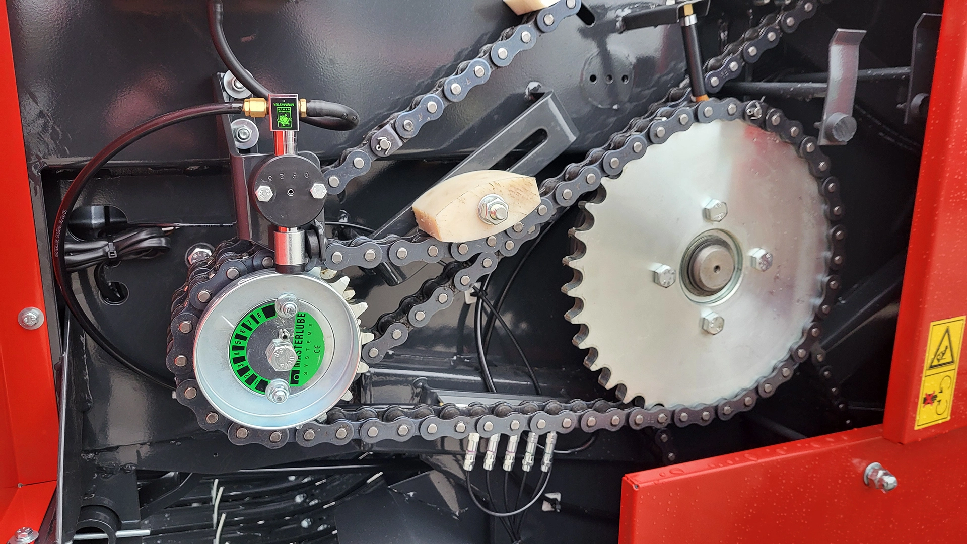 Centralne smarowanie łożysk (standard) - listwa zbiorcza umożliwia szybkie i wygodne smarowanie najważniejszych łożysk oraz elementów ruchomych prasy. Opcjonalny system automatycznego smarowania głównych łańcuchów napędowych wydłuża ich żywotność i ogranicza codzienną obsługę.