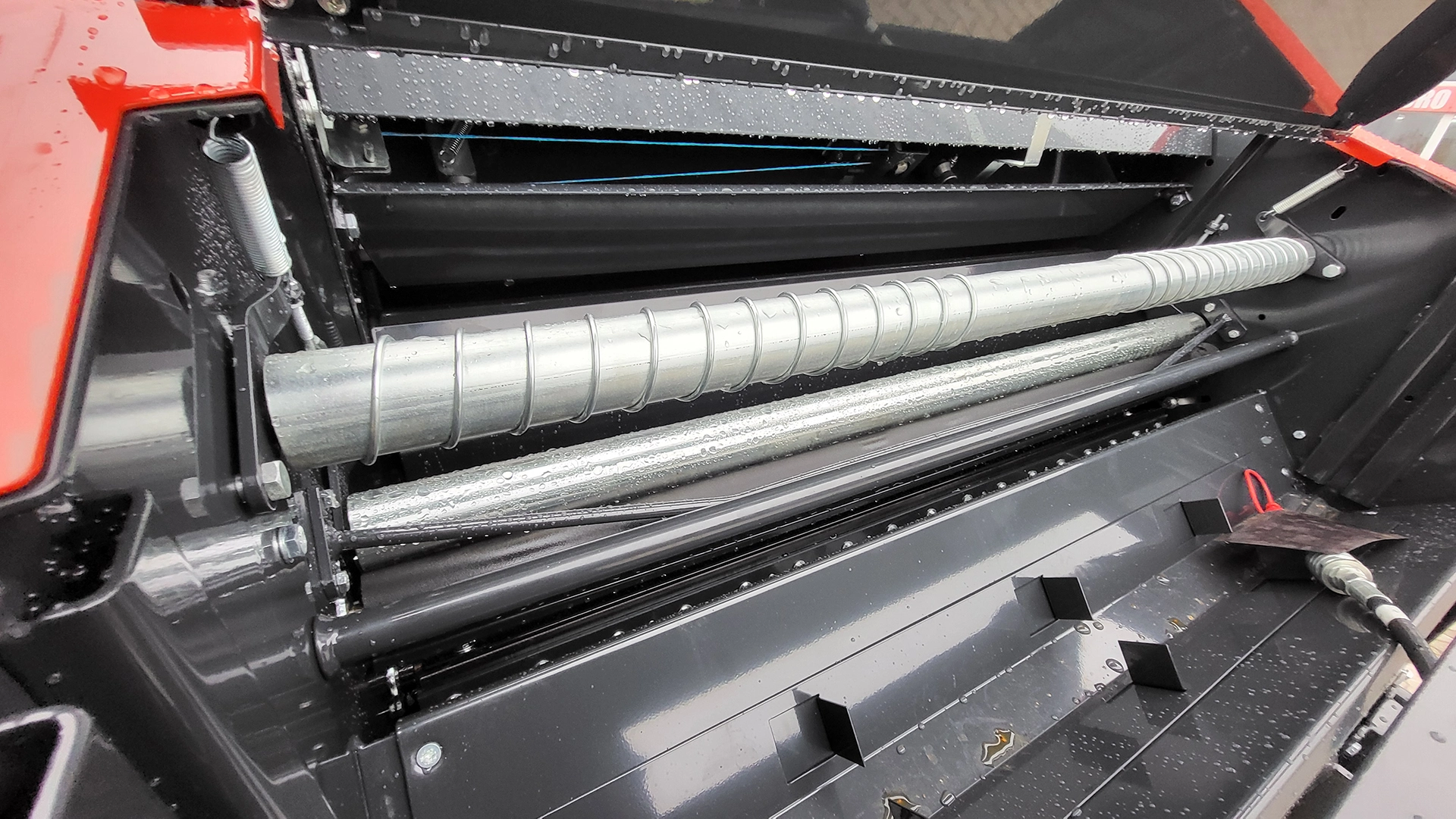 L’équipement standard comprend un rouleau de pression qui facilite le transfert du matériau par le ramasseur vers le rotor.