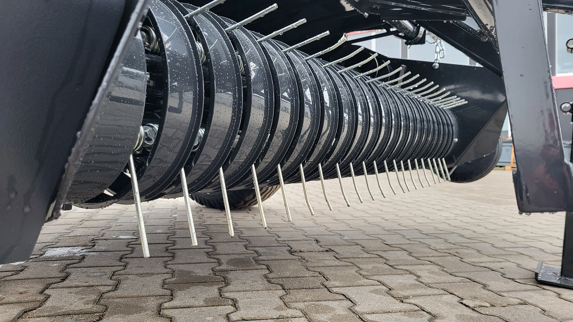 Rotacyjny zespół podający zapewnia równomierne i płynne podawanie materiału do komory zwijania, zwiększając wydajność i tempo pracy. W wersji Z562 RN rotor współpracuje z 13 nożami tnącymi, które wstępnie rozdrabniają materiał, umożliwiając uzyskanie lepiej zagęszczonych bel i wyższej jakości paszy. Każdy nóż posiada indywidualne zabezpieczenie sprężynowe, chroniące układ przed uszkodzeniem przez ciała obce.